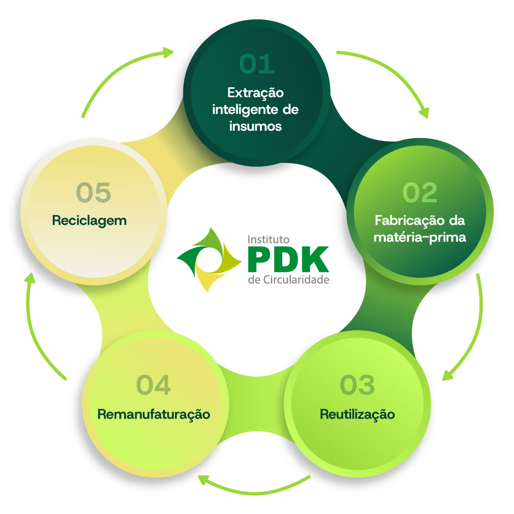 Atuamos na estratégia e implementação do fechamento de ciclos técnicos da economia circular, eliminando o descarte e criando mercado para materiais secundários, transformando resíduos em recursos.